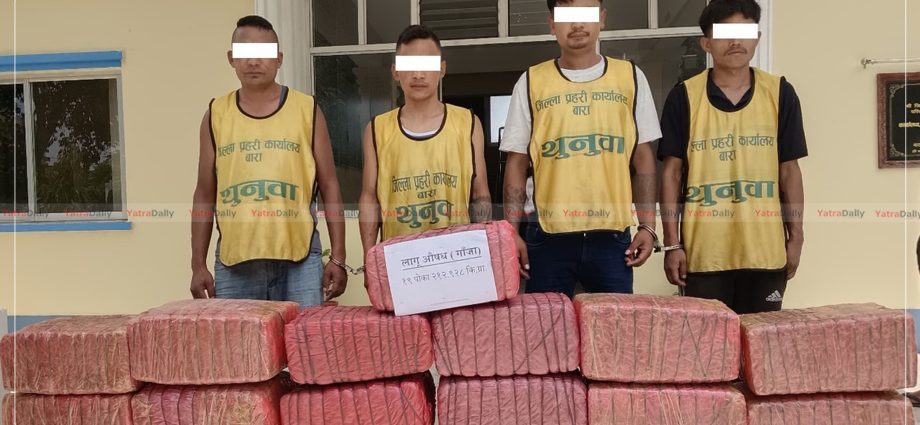 बारा । बारा प्रहरीले ठूलो परिमाणमा गाँजा बरामद गर्नुको साथै चार जनालाई शनिबार नियन्त्रणमा लिएको छ। प्रहरीले एक पिक अप गाडीलाई समेत नियन्त्रणमा लिएको छ। जिल्ला प्रहरी कार्यालय बारा अनुसार प्रदेश ०३–०१–०२४ च ४६३० नम्बरको सेतो रंगको पिकअप गाडी तथा त्यस्मा सवार चार जनालाई नियन्त्रणमा लिइएको हो। प्रहरीले लागु औषध गाँजा जस्तो देखिने पदार्थ २१२ किलो ९२८ ग्राम वरामद गरेको छ। उक्त गाडीमा सवार मकवानपुरको थाहा नगरपालिका वडा नं. ४ तालुङ बस्ने पिकअप गाडीको चालक २८ वर्षीय रबि कार्कीलाई प्रहरीले नियन्त्रणमा लिएको हो। थाहा नगरपालिकाको वडा नं.१२ टिसटुङ बस्ने ४६ वर्षीय बिर बहादुर गोले,मकबानपुरको हेटौडा नगरपालिका वडा नं. १४ बस्ने उतरपानीका २३ वर्षीय साजन मुक्तान,धादिङ जिल्लाको थाक्रे गाँउपालिका वडा नं. ७ आपसी चौक ३१ वर्षीय महेश तामाङलाई प्रहरीले नियन्त्रणमा लिएको हो। हेटौडाबाट प्रसौनी गण्डक तर्फ लागु औषध गाँजा जस्तो देखिने पदार्थ आई रहेको छ भन्ने बिशेष सुचनाको अधारमा प्रहरीले जाँच गरेको हो। जिल्ला प्रहरी कार्यालय बाराबाट प्रहरी निरीक्षक खेमप्रसाद नेपालको कमाण्डमा ईलाका प्रहरी कार्यालय सिमरा र प्रसौनी बाराबाट खटिएको संयुक्त प्रहरी टोलिले जाँच गरेको हो। बाराको परवानिपुर गाँउपालिका वडा नं. ५ बहुअरी स्थित गण्डक नहरको सडक खण्डमा चेक प्वाईन्ट थापी सवारी साधन तथा पैदल यात्री समेतलाई जाँच गरिएको हो। हेटौडाबाट प्रसौनी गण्डक तर्फ आउदै गरेको सो पिकअप गाडीलाई प्रहरीले जाँच गरेको हो। उक्त पिकअप गाडीमा धानको भुष भित्र लुकाई छिपाई लगि रहेको लागु औषध गाँजा जस्तो देखिने पदार्थ २१२ किलो ९२८ ग्राम वरामद भएको हो। उक्त नियन्त्रणमा लिइएका व्यक्तिमाथि थप अनुसन्धान भइरहेको जिल्ला प्रहरी कार्यालय बाराका प्रवक्ता एवम् प्रहरी नायब उपरीक्षक बिजयराज पण्डितले जानकारी दिएका छन् ।