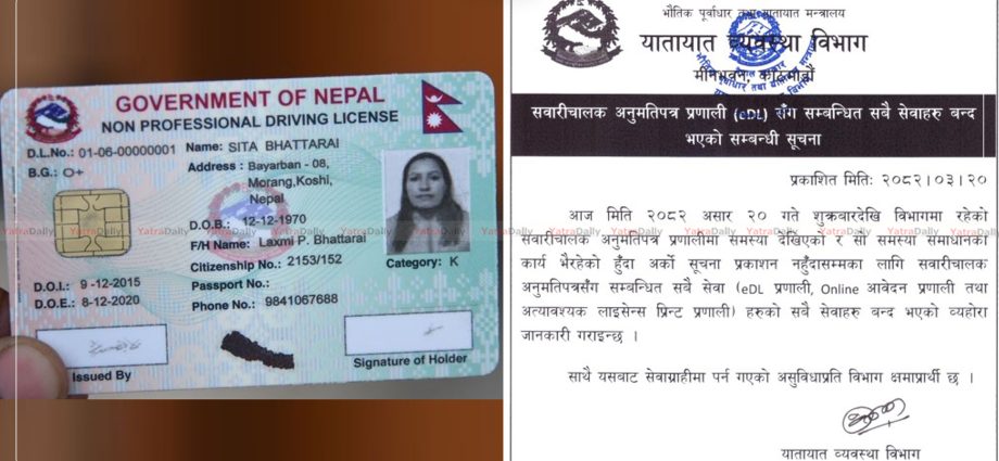 वीरगञ्ज । सवारी चालक अनुमति पत्र (लाइसेन्स) प्रणालीमा प्राविधिक समस्या देखिएपछि उक्त प्रणालीसँग सम्बन्धित सबै सेवा शुक्रवारदेखि बन्द गरिएको छ । यातायात व्यवस्था विभागले सूचना प्रकाशित गर्दै असार २० गतेदेखि सवारी चालक अनुमति पत्र प्रणाली (ईडीएल) मा समस्या देखिएको र समाधानको काम भइरहेकाले अर्को सूचना प्रकाशित नभएसम्म सेवा बन्द रहने जानकारी दिएको हो । विभागद्वारा जारी सूचनामा भनिएको छ, “सवारी चालक अनुमति पत्रसँग सम्बन्धित ईडीएल प्रणाली, अनलाइन आवेदन प्रणाली तथा अत्यावश्यक लाइसेन्स प्रिन्ट प्रणालीसमेत सबै सेवा बन्द गरिएको छ ।” विभागले प्राविधिक समस्या समाधानका लागि आवश्यक काम भइरहेको जनाउँदै सेवाग्राहीलाई परेको असुविधाप्रति क्षमा याचना समेत गरेको छ ।