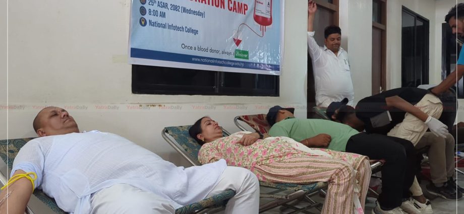वीरगञ्ज । वीरगञ्जस्थित नेशनल इन्फोटेक कलेजले बुधवार आफ्नो प्राङ्गणमा आयोजना गरेको वृहत् रक्तदान कार्यक्रममा २४ महिलासहित १६९ जनाले रक्तदान गरेका छन् । पछिल्लो समय गर्मी बढेसँगै वीरगञ्जमा देखिएको रगतको अभावलाई पूर्ति गर्ने उद्देश्यले आयोजित उक्त कार्यक्रममा कलेजका शिक्षक, कर्मचारी, विद्यार्थी र सर्वसाधारणको उल्लेखनीय सहभागिता रहेको थियो । कार्यक्रमको उद्घाटन कलेजका संस्थापक निर्देशक मनिष सिंह र प्रमुख काजल सिंहले रक्तदान गरेर गरेका थिए । रक्तदान कार्यक्रमको मुख्य उद्देश्य रगतको अभावलाई पूर्ति गर्नुका साथै विद्यार्थीहरूमाझ रक्तदानप्रति जनचेतना फैलाउनु रहेको आयोजकले जनाएको छ । कार्यक्रममा बोल्दै कलेजका संस्थापक निर्देशक मनिष सिंहले रक्तदानलाई सबैभन्दा ठूलो दानमध्ये एक भएको बताए । उनले भने, “विद्यार्थी उमेरदेखि नै रक्तदानको महत्वबारे जानकारी भएमा भविष्यमा उनीहरूले नियमित रूपमा रक्तदान गर्नेछन् । रक्तदानप्रति समाजमा रहेका भ्रमहरू चिर्न र विद्यार्थीहरूलाई प्रोत्साहित गर्न हामीले कार्यक्रम आयोजना गरेका हौँ ।” उनले रक्तदानले मानव जीवन बचाउन महत्त्वपूर्ण भूमिका खेल्ने भन्दै सबैलाई यस्ता कार्यमा सहभागी हुन आह्वान गरे । नेपाल रेडक्रस सोसाइटीद्वारा सञ्चालित रक्तसञ्चार केन्द्र, वीरगञ्जको प्राविधिक सहयोगमा सम्पन्न भएको कार्यक्रमले स्थानीय स्तरमा रगतको अभावलाई कम गर्न महत्त्वपूर्ण योगदान पुर्याएको छ । रक्तसञ्चार केन्द्र वीरगञ्जका प्रमुख सौरभ राज पाण्डेले नेशनल इन्फोटेक कलेजको पहलको प्रशंसा गर्दै रगतको अभाव पूर्ति गर्न सहयोग गरेकोमा आभार व्यक्त गरे । उनले भने, “वीरगञ्जमा रगतको चरम अभाव भइरहेको अवस्थामा यस्ता कार्यक्रमले ठूलो राहत प्रदान गर्छ । हामी अन्य संघसंस्थाहरूलाई पनि यस्ता रक्तदान कार्यक्रम आयोजना गरी सहयोग गर्न अपिल गर्छौँ ।” कार्यक्रममा सहभागी वीरगञ्जस्थित मानवसेवा आश्रमका प्रमुख देवेश गुप्ताले नेशनल इन्फोटेकको सामाजिक कार्यको प्रशंसा गरे । उनले भने, “रगतको अभावले धेरैको ज्यान जोखिममा परिरहेको बेला कार्यक्रमबाट सङ्कलन भएको रगतले सयौँको ज्यान जोगाउन सहयोग पुग्नेछ । यस्तो मानवीय कार्यमा सहयोग गर्ने सबैप्रति हामी कृतज्ञ छौँ ।” नेशनल इन्फोटेक कलेजले विगतमा पनि सामाजिक कार्यमा सक्रिय सहभागिता जनाउँदै आएको छ । केही दिनअघि मात्र कलेजले वीरगञ्जस्थित त्रिजुद्ध महावीर प्रसाद रघुवीर राम प्राविधिक माध्यमिक विद्यालयमा सञ्चालित विशेष विद्यालयका विद्यार्थीहरूका लागि कम्प्युटर र ल्यापटप सहयोग गरेको थियो । त्यस्तै, उक्त विद्यालयका विद्यार्थीहरूलाई पाठ्य सामग्री उपलब्ध गराउने प्रतिबद्धता पनि व्यक्त 